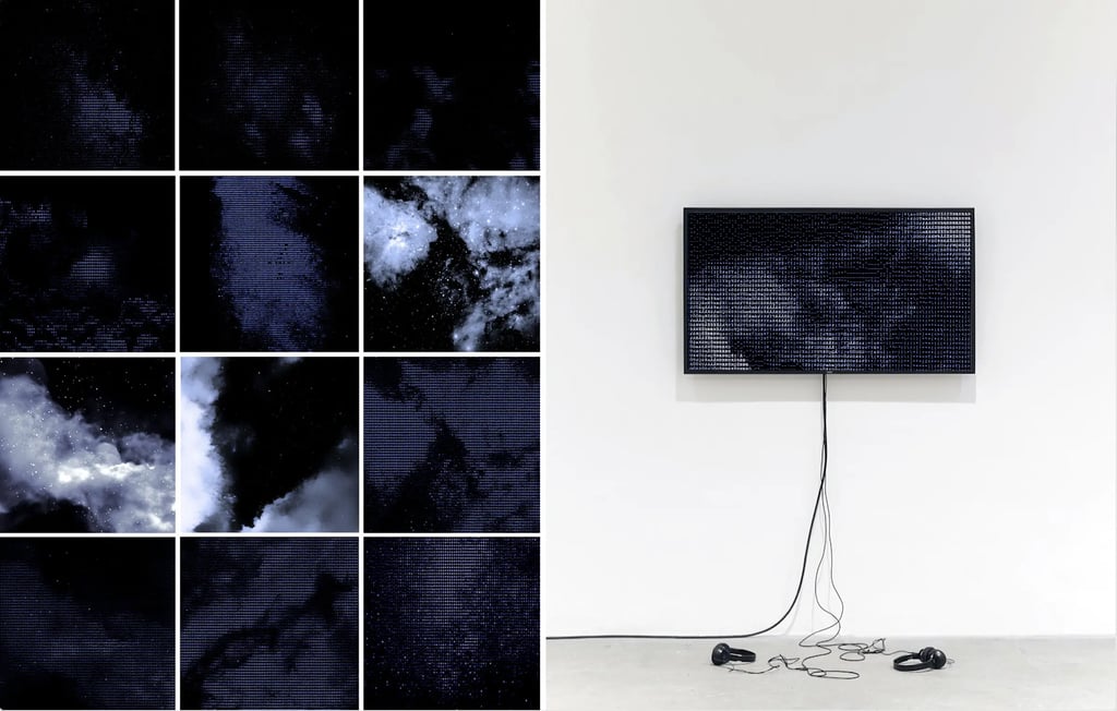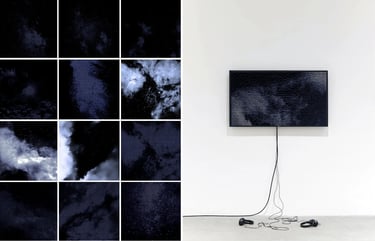 The DATA CLOUDS series refers to the (in)visibilities of digital data that, according to time zones, travel driven by the wind of networks to unknown destinations. Translated here into illusory correlations, these "clouds" reveal a pareidolia composed, not of water particles, but of fragments of lives, coded in digital clouds and stored in 45 million centers all over the World.